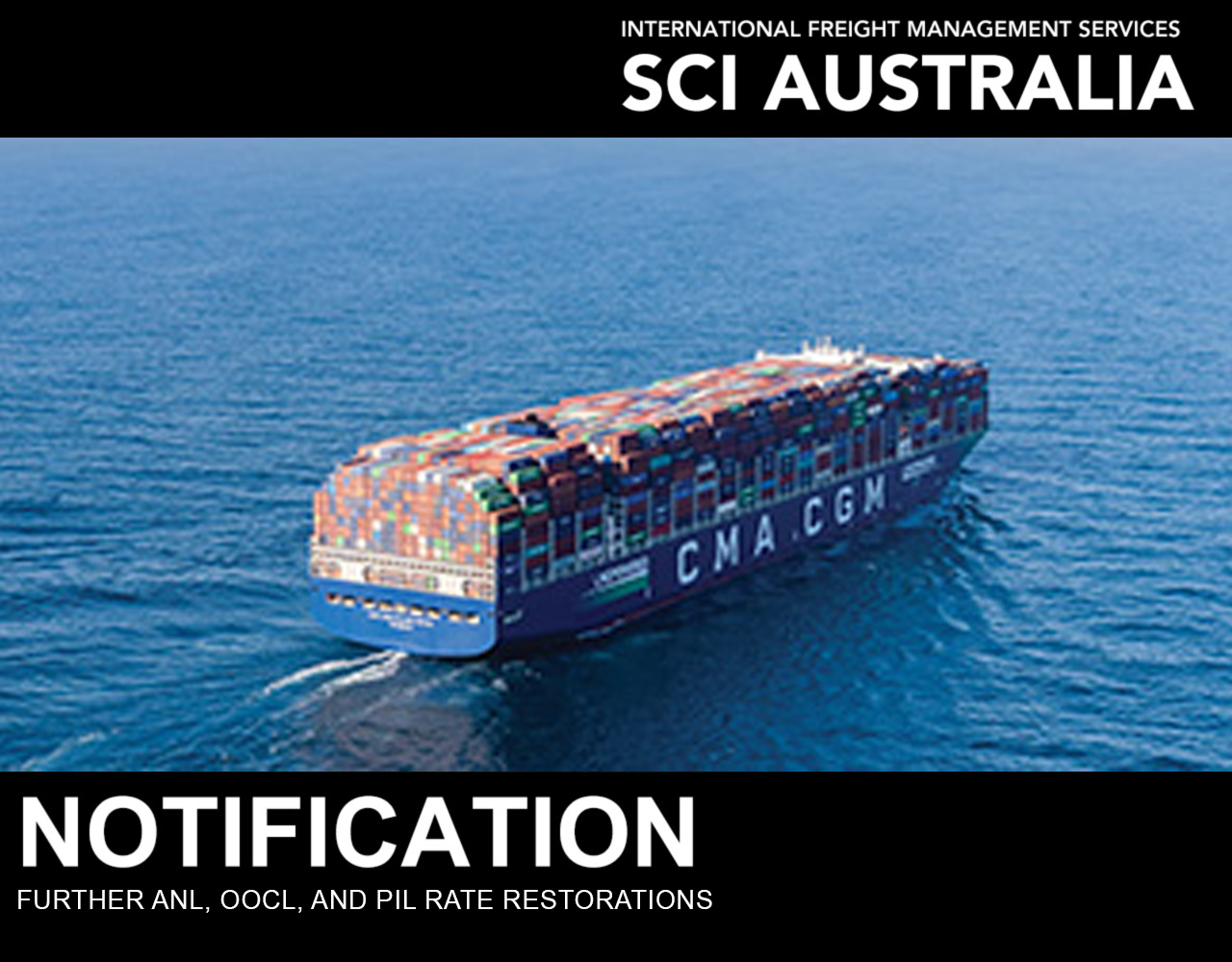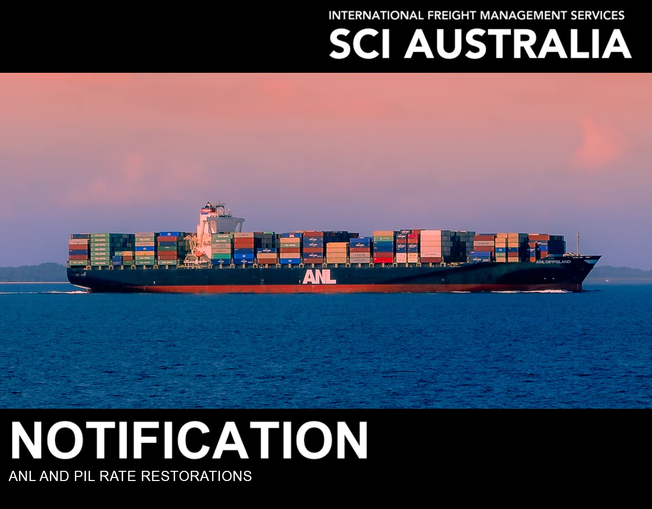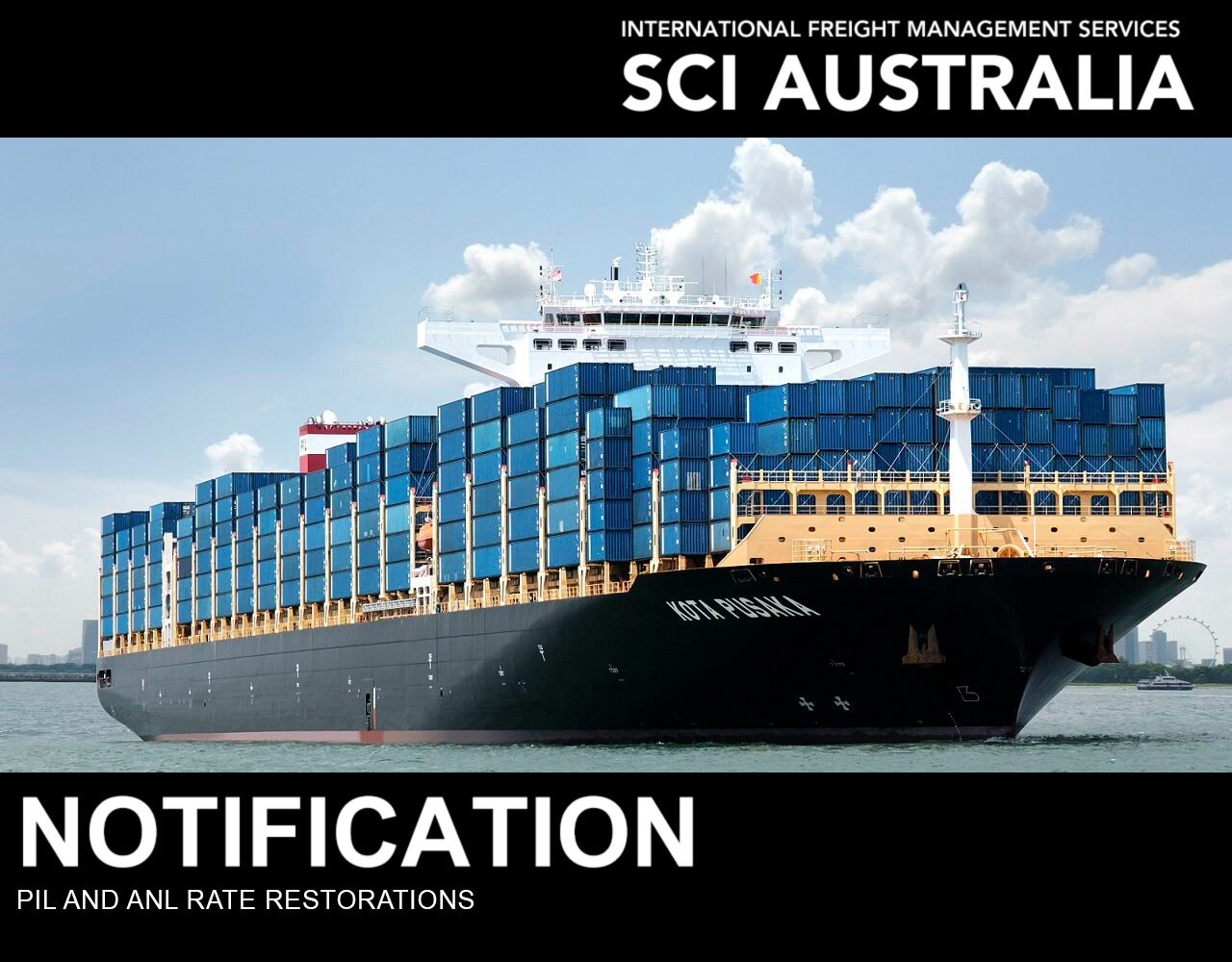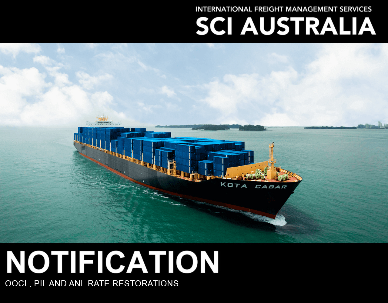 OOCL and PIL have advised that there will be a Rate Restoration of US$150 per TEU from 15th of September 2023. ANL’s is US$100 per TEU.