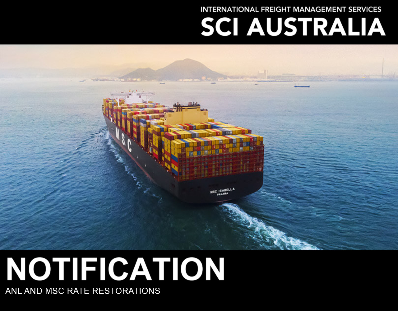ANL and MSC have advised that there will be a Rate Restoration of US$150 per 20′ and US$300 per 40′ from 1st of September 2023